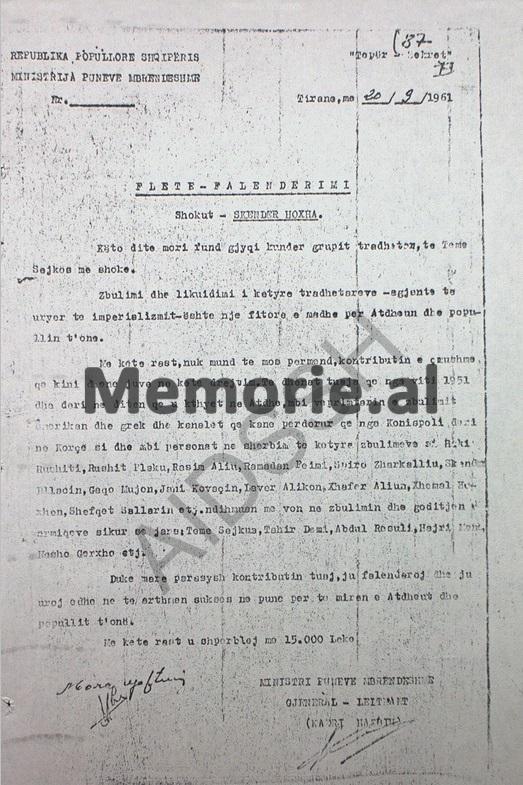 DOKUMENTI I VITIT 1961, KU MINISTRI I PUNËVE TË BRENDSHME KADRI HAZBIU, I AKORDON NJË FLETË – FALENDERIMI DHE 15.000 LEKË SHPËRBLIM AGJENTIT SKËNDER HOXHA, “PËR KONTRIBUTIN E DHËNË NË ZBULIMIN E GRUPIT ARMIQËSOR TË TEME SEJKOS”.